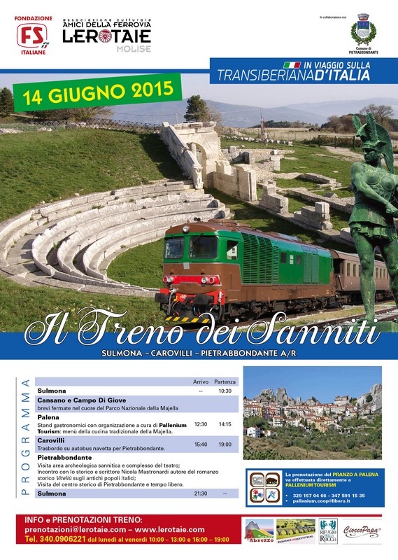 Per domenica 14 giugno è infatti in programma il Treno dei Sanniti, una partenza a bordo del convoglio d'epoca della Fondazione FS Italiane con meta di giornata il borgo altomolisano di Pietrabbondante (IS), custode dell'area archeologica sannitica più significativa e suggestiva di tutto l'Appennino, con il suo teatro in pietra perfettamente conservato.
