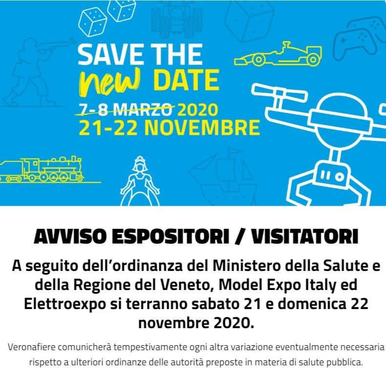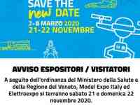 Model Expo Italy ed Elettroexpo, invece, previste in calendario sabato 7 e domenica 8 marzo, si terranno sabato 21 e domenica 22 novembre 2020.