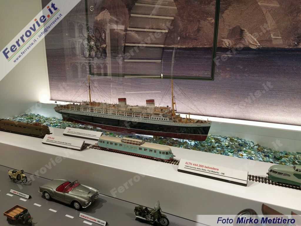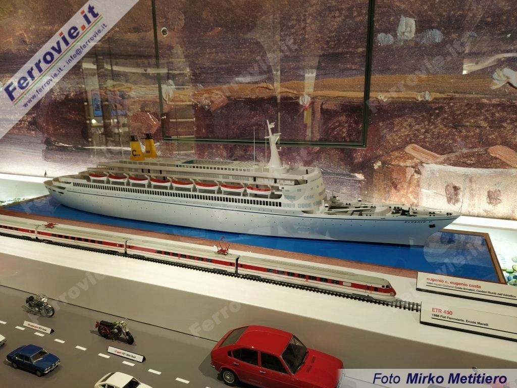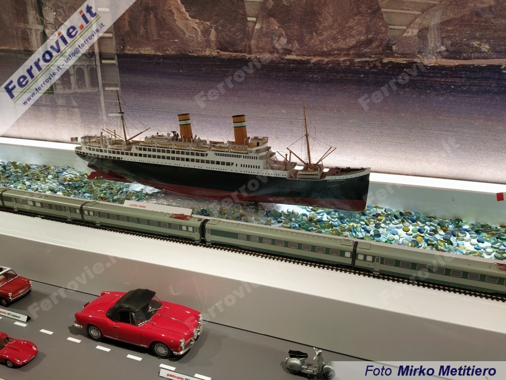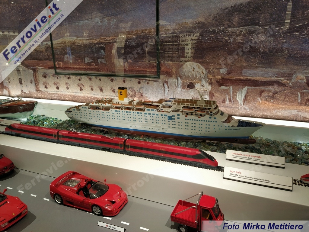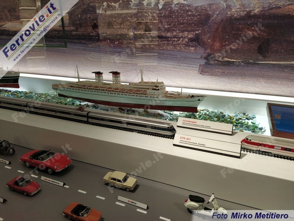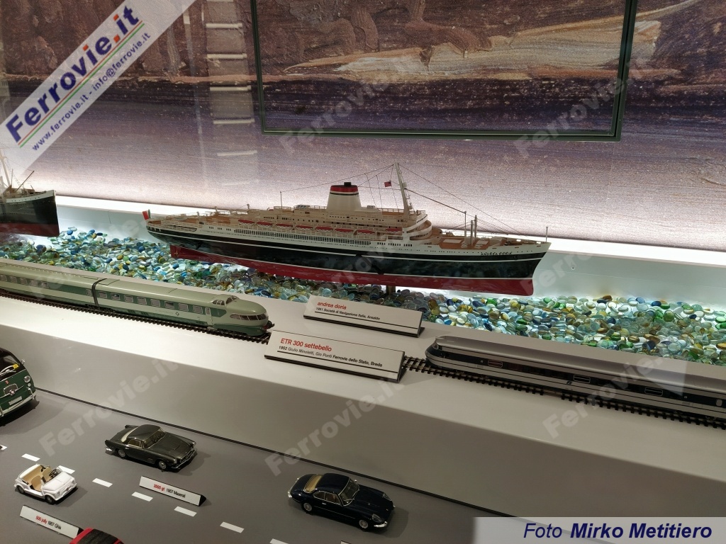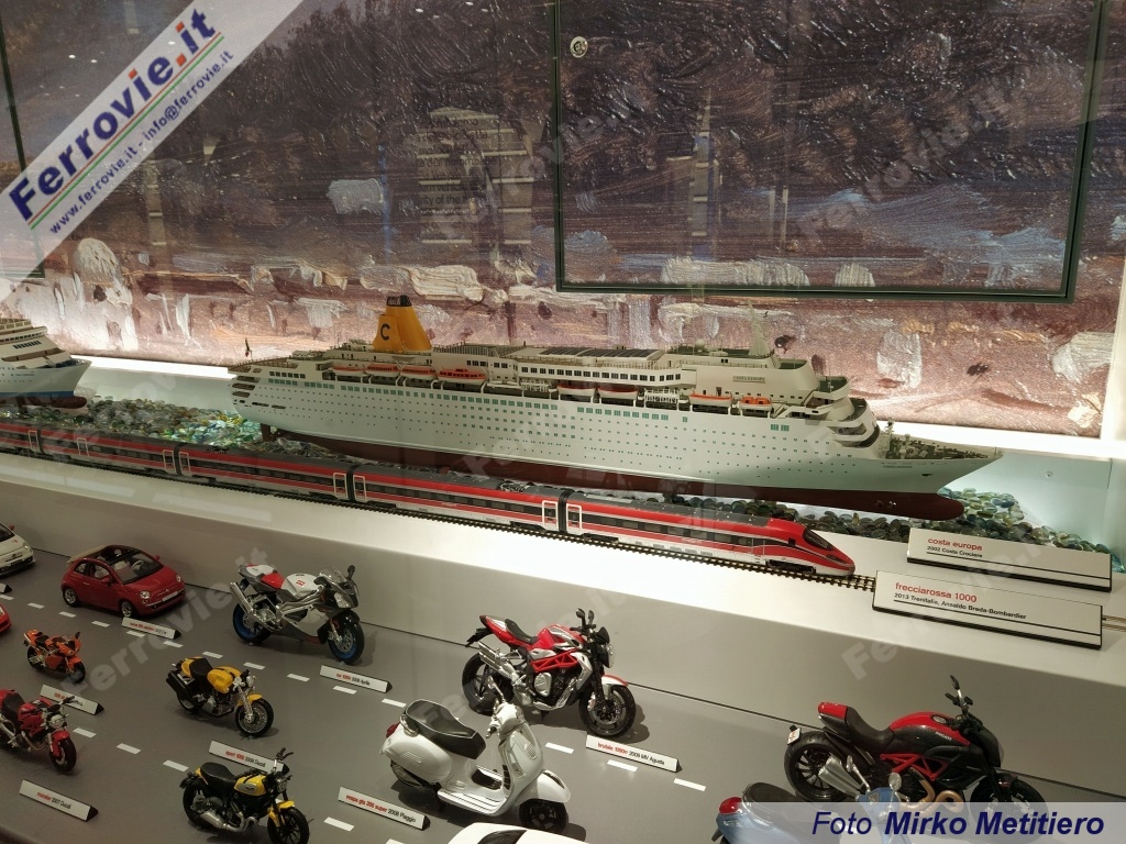 Racchiudere in pochi metri storici mezzi di trasporto non è stato facile, ma grazie alla creatività ecco di fianco a pezzi unici reali come il Ciao, la Vespa, il Mosquito e le biciclette Bianchi, un diorama (un plastico tridimensionale) ampio di 12 metri che ha permesso di esporre contemporaneamente, in scala ridotta, automobili leggendarie, treni celebri, grandi navi Costa e non solo.
