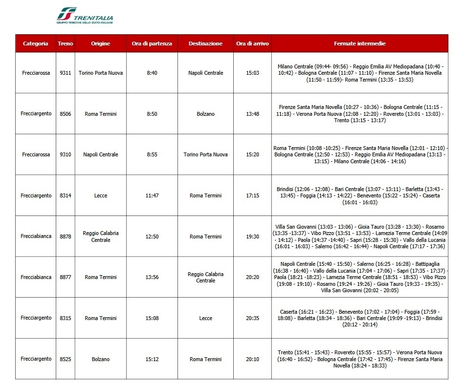 Sono cancellate le fermate per servizio viaggiatori nelle stazioni di Genova Brignole, Roma Ostiense, Aversa, Battipaglia, Paestum, Agropoli, Vallo della Lucania e Sapri.