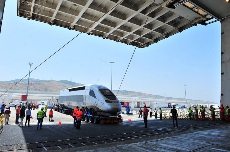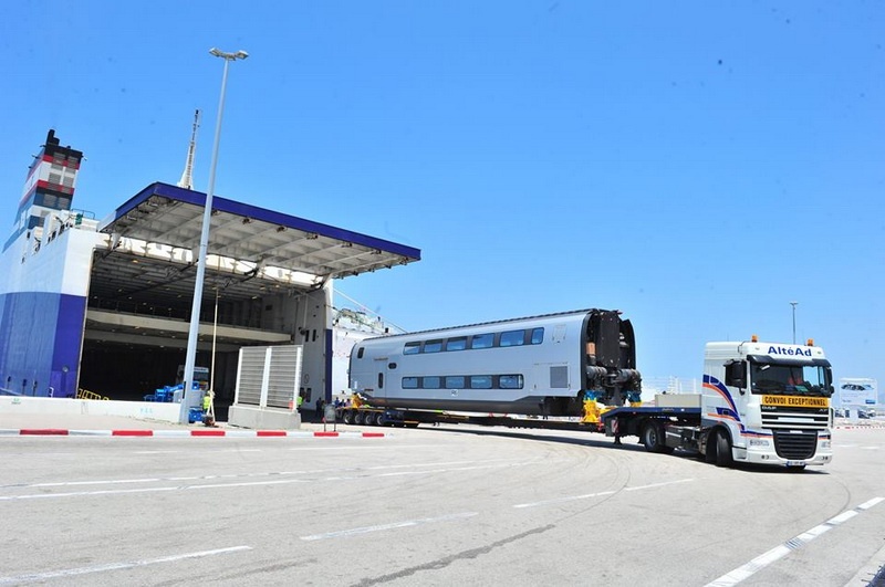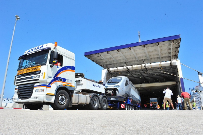 TANGERI (Marocco) - Arrivano dal mare i nuovi treni per la prima linea ferroviaria alta velocità africana. Lunedì 29 giugno dal traghetto "Ville de Bordeaux" nel porto di Tangeri è sbarcato il primo di 12 convogli "duplex" prodotti da Alstom per la marocchina ONCF - Office National des Chemins de Fer, destinati alla LGV - Ligne à Grand Vitesse del Marocco.