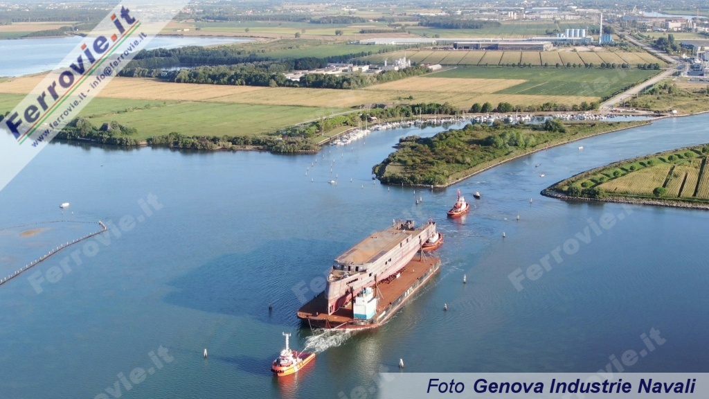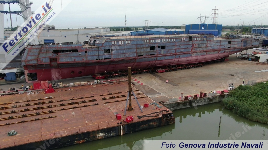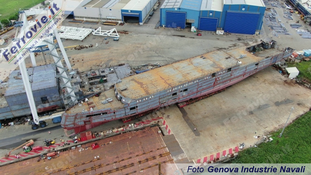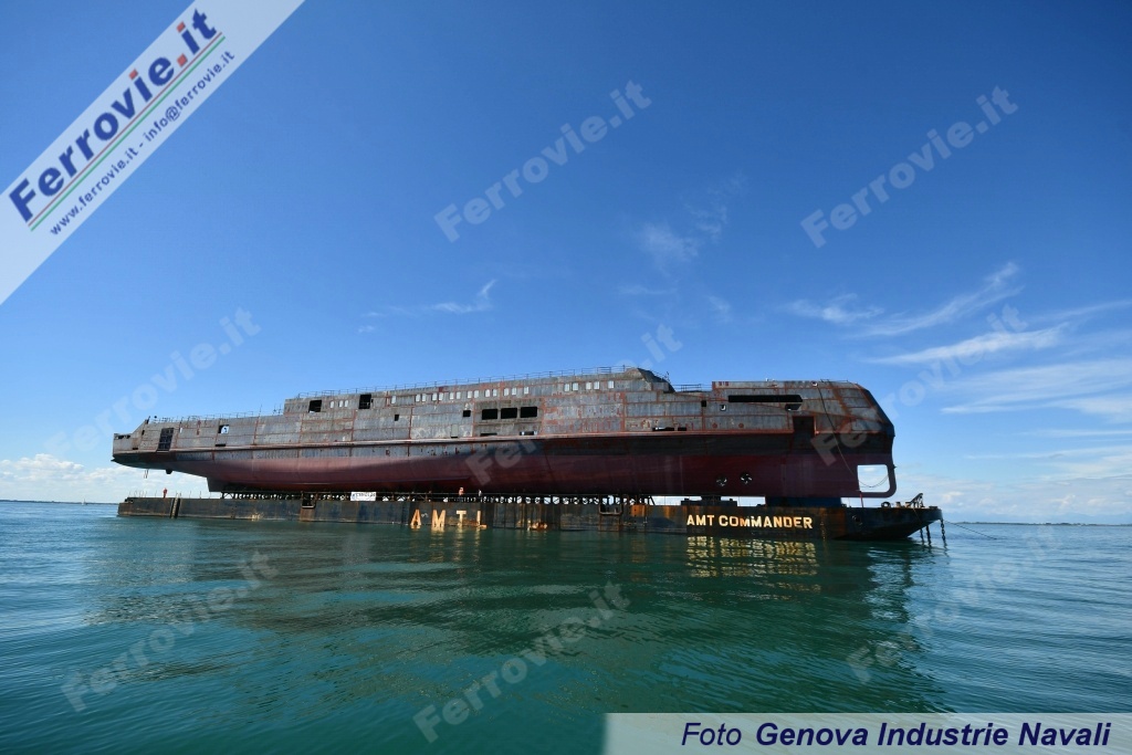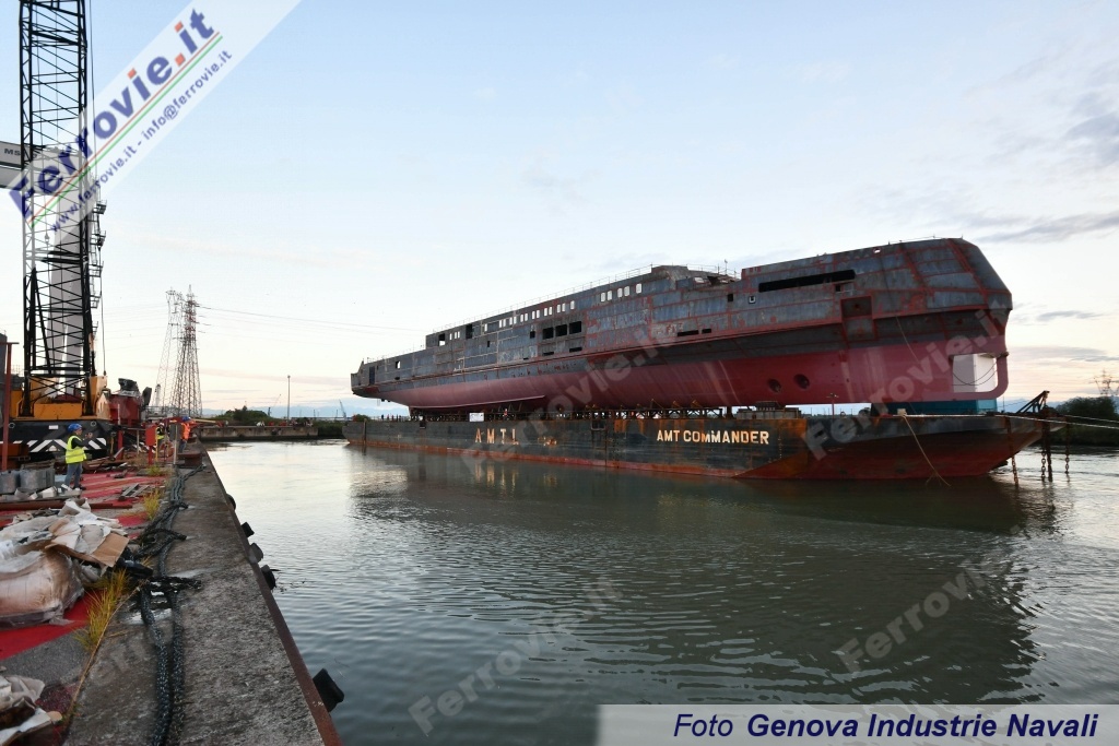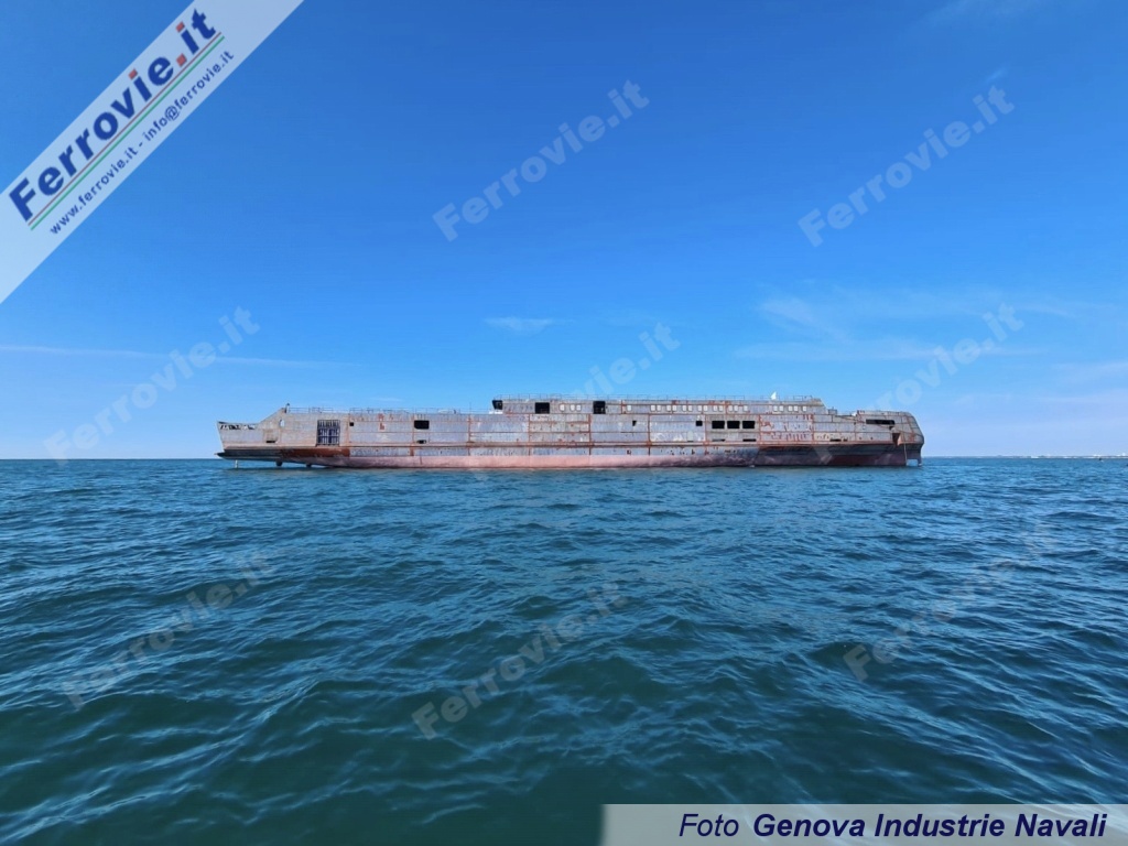 Il traghetto è stato infine agganciato dal rimorchiatore Gianemilio C. e il 3 settembre è partito verso Genova dove, in assenza di complicazioni dovute alle condizioni meteo marine, tra dieci giorni troverà spazio nelle banchine di Mariotti e San Giorgio del Porto. Qui, lo scafo già provvisto dei motori, dei generatori, dei macchinari di propulsione e degli impianti installati a bordo durante gli allestimenti preliminari a San Giorgio di Nogaro, verrà ultimato con l'installazione dei due fumaioli e le sovrastrutture già pre-allestiti nei mesi precedenti; i lavori proseguiranno poi con gli arredi, l'armamento ferroviario e il completamento di tutti gli impianti.