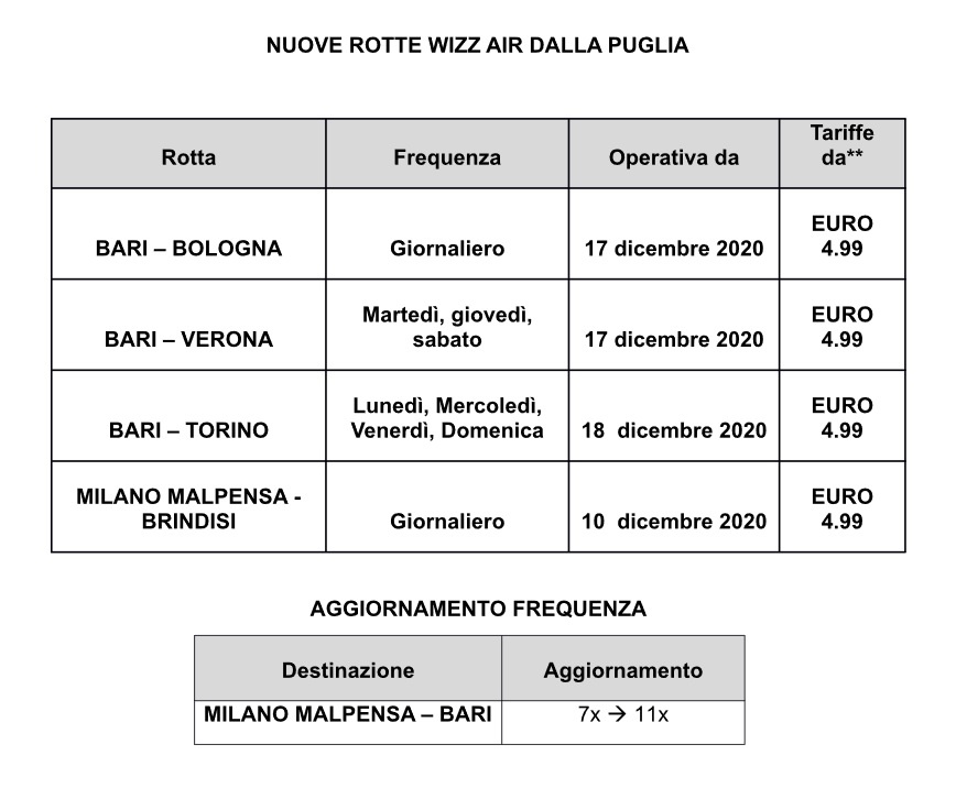 L'ulteriore sviluppo dell'offerta di Wizz Air da Bari, Milano Malpensa e Catania, così come l'istituzione della terza base italiana a Bari, sottolineano l'impegno a lungo termine della compagnia ad offrire più accessibili e green opportunità di viaggio ai suoi passeggeri italiani. Wizz Air ha iniziato a volare su Bari nel 2010, e da allora ha trasportato circa 1 milione di passeggeri da e per la città. L'istituzione della base creerà più di 40 nuovi posti di lavoro in modo diretto. Con questo investimento, Wizz Air contribuirà allo sviluppo economico e alla creazione di centinaia di nuovi posti di lavoro nel mercato locale****.
